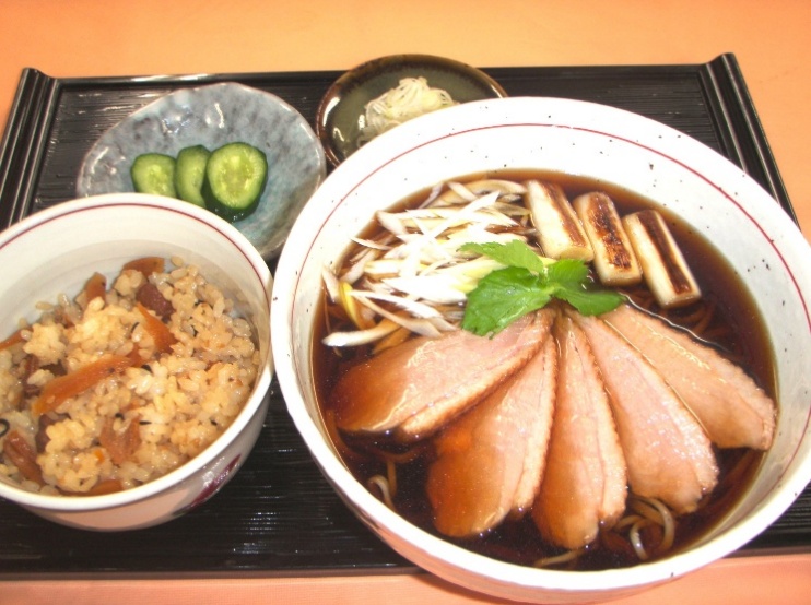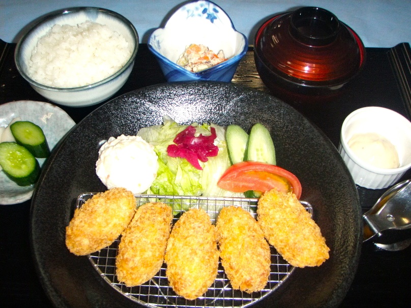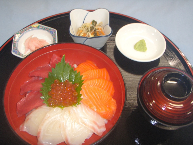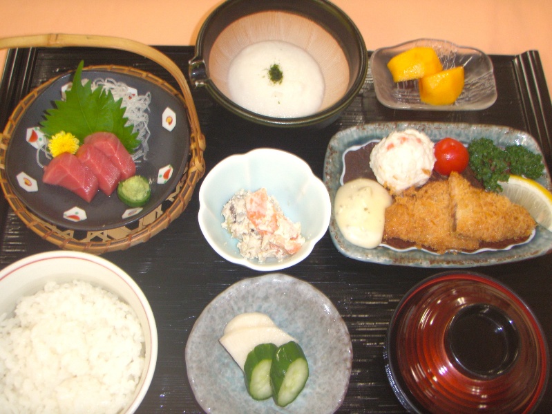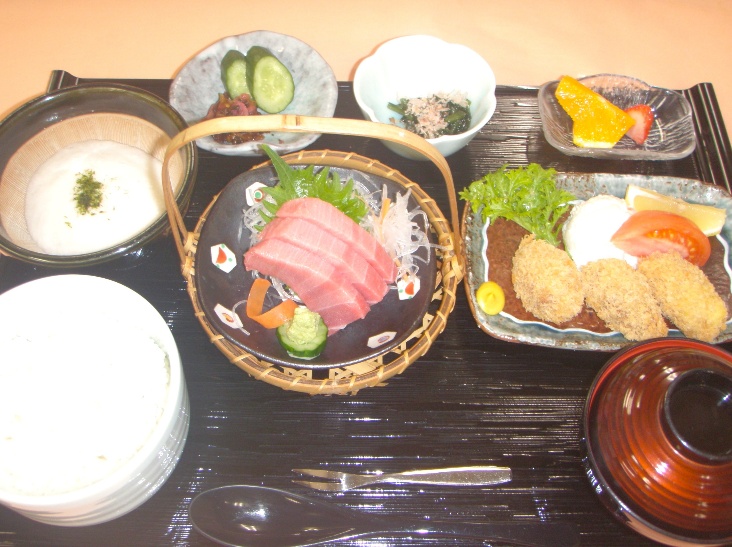 焼き鮭・焼海苔・生玉子・小鉢・お新香・ご飯・味噌汁
